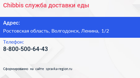 Chibbis, служба доставки еды по адресу Ростовская область, Волгодонск, Ленина, 1/2 в дальнейшем Организация, размещена в следующих категориях: