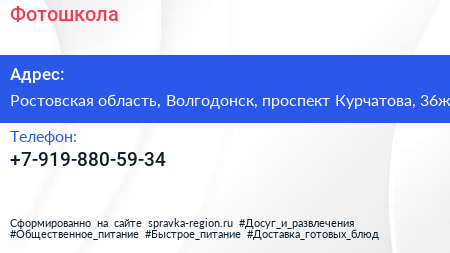 Фотошкола по адресу Ростовская область, Волгодонск, проспект Курчатова, 36ж в дальнейшем Организация, размещена в следующих категориях: