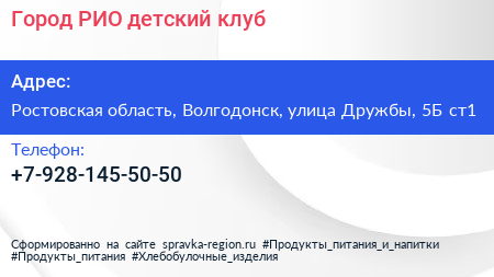 Город РИО, детский клуб по адресу Ростовская область, Волгодонск, улица Дружбы, 5Б ст1 в дальнейшем Организация, размещена в следующих категориях: