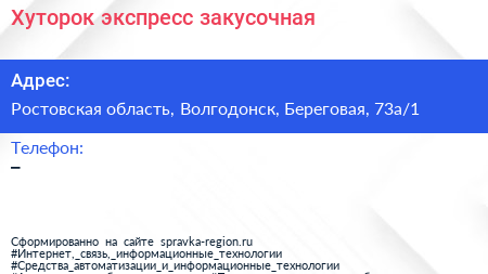 Хуторок, экспресс-закусочная по адресу Ростовская область, Волгодонск, Береговая, 73а/1 в дальнейшем Организация, размещена в следующих категориях: