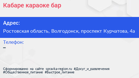Кабаре, караоке-бар по адресу Ростовская область, Волгодонск, проспект Курчатова, 4а в дальнейшем Организация, размещена в следующих категориях: