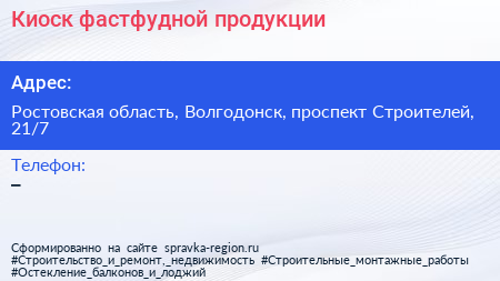 Киоск фастфудной продукции по адресу Ростовская область, Волгодонск, проспект Строителей, 21/7 в дальнейшем Организация, размещена в следующих категориях:
