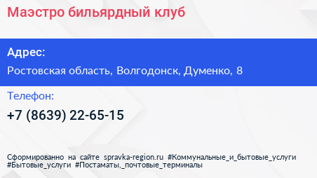 Маэстро, бильярдный клуб по адресу Ростовская область, Волгодонск, Думенко, 8 в дальнейшем Организация, размещена в следующих категориях: