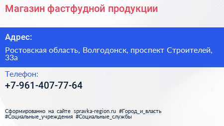 Магазин фастфудной продукции по адресу Ростовская область, Волгодонск, проспект Строителей, 33а в дальнейшем Организация, размещена в следующих категориях: