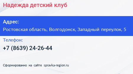 Надежда, детский клуб по адресу Ростовская область, Волгодонск, Западный переулок, 5 в дальнейшем Организация, размещена в следующих категориях: