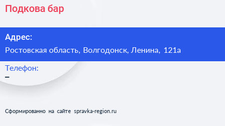 Подкова, бар по адресу Ростовская область, Волгодонск, Ленина, 121а в дальнейшем Организация, размещена в следующих категориях: