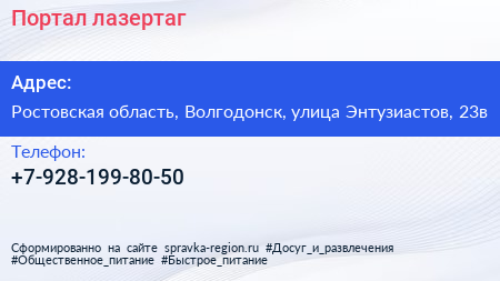 Портал, лазертаг по адресу Ростовская область, Волгодонск, улица Энтузиастов, 23в в дальнейшем Организация, размещена в следующих категориях: