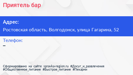 Приятель, бар по адресу Ростовская область, Волгодонск, улица Гагарина, 52 в дальнейшем Организация, размещена в следующих категориях: