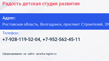 Радость, детская студия развития по адресу Ростовская область, Волгодонск, проспект Строителей, 39 в дальнейшем Организация, размещена в следующих категориях:
