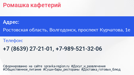 Ромашка, кафетерий по адресу Ростовская область, Волгодонск, проспект Курчатова, 1е в дальнейшем Организация, размещена в следующих категориях: