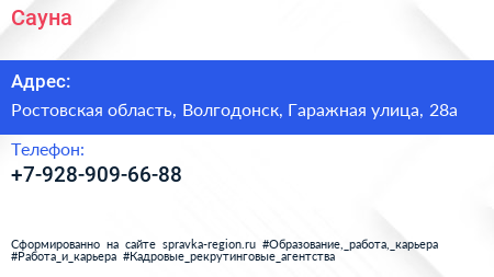 Сауна по адресу Ростовская область, Волгодонск, Гаражная улица, 28а в дальнейшем Организация, размещена в следующих категориях: