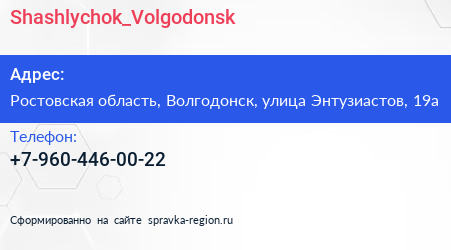 Shashlychok_Volgodonsk по адресу Ростовская область, Волгодонск, улица Энтузиастов, 19а в дальнейшем Организация, размещена в следующих категориях: