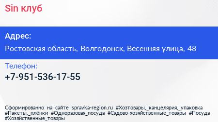 Sin, клуб по адресу Ростовская область, Волгодонск, Весенняя улица, 48 в дальнейшем Организация, размещена в следующих категориях:
