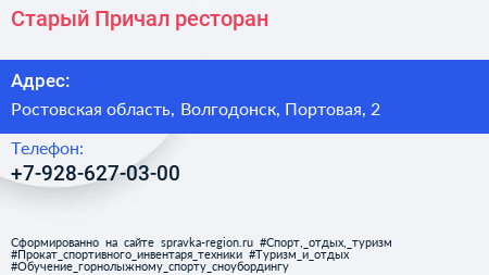 Старый Причал, ресторан по адресу Ростовская область, Волгодонск, Портовая, 2 в дальнейшем Организация, размещена в следующих категориях: