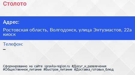 Столото по адресу Ростовская область, Волгодонск, улица Энтузиастов, 22а киоск в дальнейшем Организация, размещена в следующих категориях: