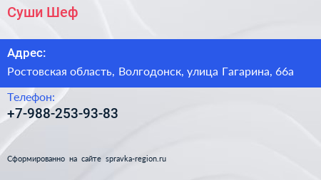 Суши Шеф по адресу Ростовская область, Волгодонск, улица Гагарина, 66а в дальнейшем Организация, размещена в следующих категориях: