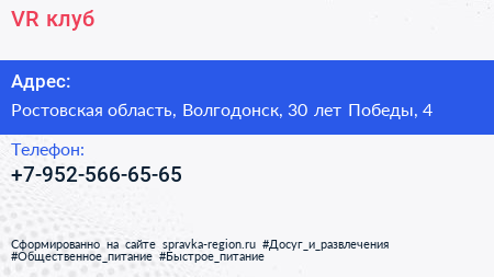 VR-клуб по адресу Ростовская область, Волгодонск, 30 лет Победы, 4 в дальнейшем Организация, размещена в следующих категориях: