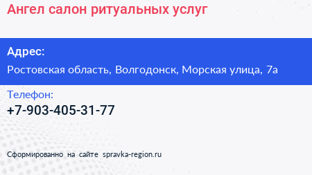 Ангел, салон ритуальных услуг по адресу Ростовская область, Волгодонск, Морская улица, 7а в дальнейшем Организация, размещена в следующих категориях: