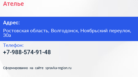 Ателье по адресу Ростовская область, Волгодонск, Ноябрьский переулок, 30а в дальнейшем Организация, размещена в следующих категориях: