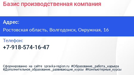 Базис, производственная компания по адресу Ростовская область, Волгодонск, Окружная, 16 в дальнейшем Организация, размещена в следующих категориях: