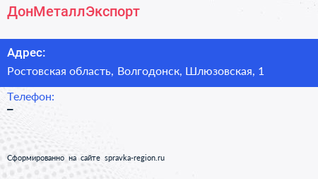 ДонМеталлЭкспорт по адресу Ростовская область, Волгодонск, Шлюзовская, 1 в дальнейшем Организация, размещена в следующих категориях: