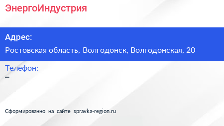ЭнергоИндустрия по адресу Ростовская область, Волгодонск, Волгодонская, 20 в дальнейшем Организация, размещена в следующих категориях:
