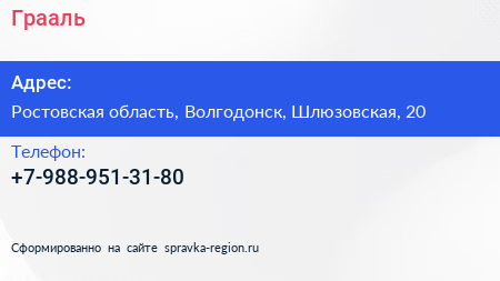 Грааль по адресу Ростовская область, Волгодонск, Шлюзовская, 20 в дальнейшем Организация, размещена в следующих категориях: