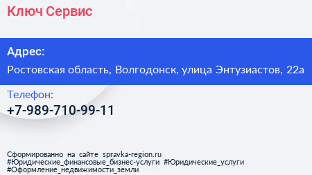 Ключ Сервис по адресу Ростовская область, Волгодонск, улица Энтузиастов, 22а в дальнейшем Организация, размещена в следующих категориях: