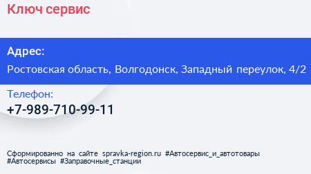Ключ сервис по адресу Ростовская область, Волгодонск, Западный переулок, 4/2 в дальнейшем Организация, размещена в следующих категориях: