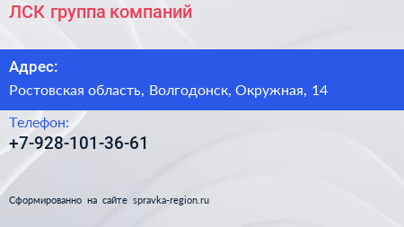 ЛСК, группа компаний по адресу Ростовская область, Волгодонск, Окружная, 14 в дальнейшем Организация, размещена в следующих категориях: