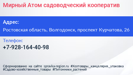 Мирный Атом, садоводческий кооператив по адресу Ростовская область, Волгодонск, проспект Курчатова, 26 в дальнейшем Организация, размещена в следующих категориях: