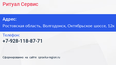 Ритуал-Сервис по адресу Ростовская область, Волгодонск, Октябрьское шоссе, 12к в дальнейшем Организация, размещена в следующих категориях: