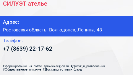 СИЛУЭТ, ателье по адресу Ростовская область, Волгодонск, Ленина, 48 в дальнейшем Организация, размещена в следующих категориях: