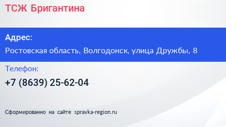 ТСЖ Бригантина по адресу Ростовская область, Волгодонск, улица Дружбы, 8 в дальнейшем Организация, размещена в следующих категориях: