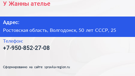 У Жанны, ателье по адресу Ростовская область, Волгодонск, 50 лет СССР, 25 в дальнейшем Организация, размещена в следующих категориях: