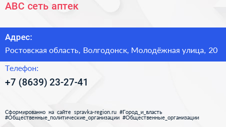 ABC, сеть аптек по адресу Ростовская область, Волгодонск, Молодёжная улица, 20 в дальнейшем Организация, размещена в следующих категориях: