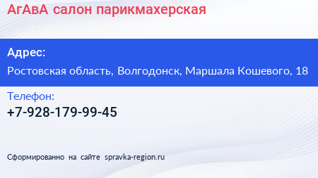 АгАвА, салон-парикмахерская по адресу Ростовская область, Волгодонск, Маршала Кошевого, 18 в дальнейшем Организация, размещена в следующих категориях: