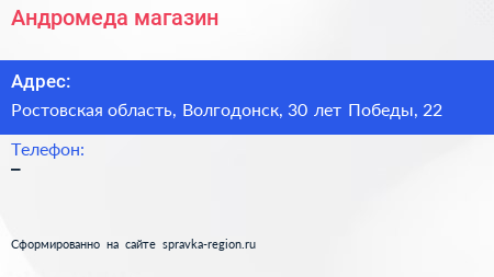 Андромеда, магазин по адресу Ростовская область, Волгодонск, 30 лет Победы, 22 в дальнейшем Организация, размещена в следующих категориях:
