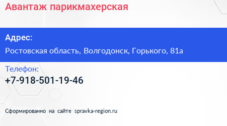 Авантаж, парикмахерская по адресу Ростовская область, Волгодонск, Горького, 81а в дальнейшем Организация, размещена в следующих категориях: