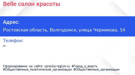 Belle, салон красоты по адресу Ростовская область, Волгодонск, улица Черникова, 14 в дальнейшем Организация, размещена в следующих категориях: