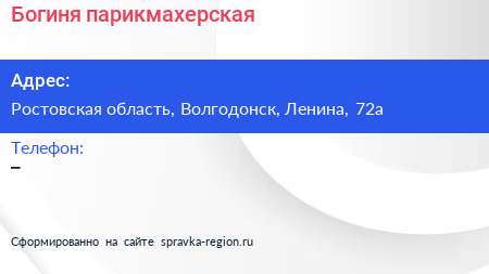 Богиня, парикмахерская по адресу Ростовская область, Волгодонск, Ленина, 72а в дальнейшем Организация, размещена в следующих категориях: