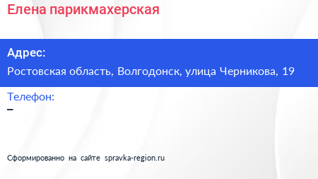 Елена, парикмахерская по адресу Ростовская область, Волгодонск, улица Черникова, 19 в дальнейшем Организация, размещена в следующих категориях: