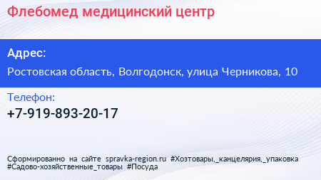 Флебомед, медицинский центр по адресу Ростовская область, Волгодонск, улица Черникова, 10 в дальнейшем Организация, размещена в следующих категориях: