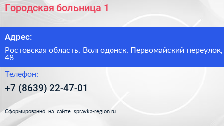 Городская больница №1 по адресу Ростовская область, Волгодонск, Первомайский переулок, 48 в дальнейшем Организация, размещена в следующих категориях: