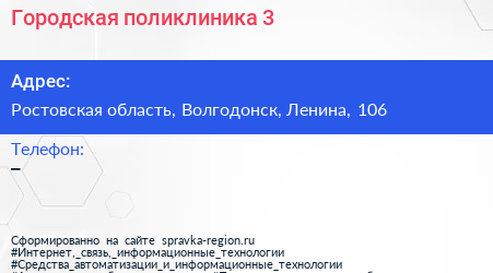 Городская поликлиника №3 по адресу Ростовская область, Волгодонск, Ленина, 106 в дальнейшем Организация, размещена в следующих категориях: