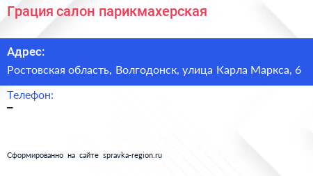Грация, салон-парикмахерская по адресу Ростовская область, Волгодонск, улица Карла Маркса, 6 в дальнейшем Организация, размещена в следующих категориях: