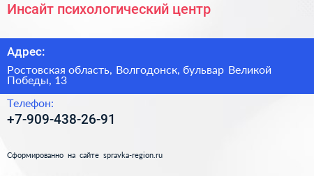 Инсайт, психологический центр по адресу Ростовская область, Волгодонск, бульвар Великой Победы, 13 в дальнейшем Организация, размещена в следующих категориях: