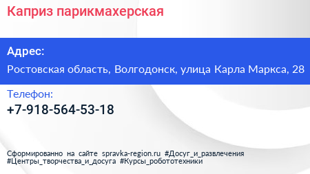 Каприз, парикмахерская по адресу Ростовская область, Волгодонск, улица Карла Маркса, 28 в дальнейшем Организация, размещена в следующих категориях: