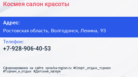 Космея, салон красоты по адресу Ростовская область, Волгодонск, Ленина, 93 в дальнейшем Организация, размещена в следующих категориях: