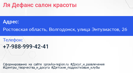 Ля Дефанс, салон красоты по адресу Ростовская область, Волгодонск, улица Энтузиастов, 26 в дальнейшем Организация, размещена в следующих категориях: